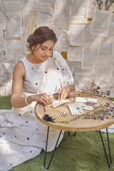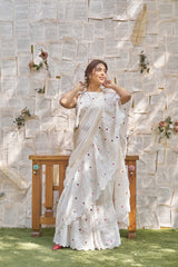A ruffled saree in fine cotton chanderi with coloured hearts , a sleeveless crop top style blouse in cotton with colourful hearts to complete the look.
