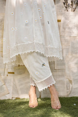 A pair of pants in cotton with embroidered daisies and honey bees styled with mesh lace at the hem.