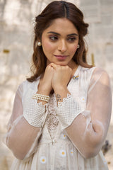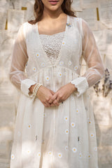 10A peplum in off-white with thread embroidered summer daisies and honey bees accented with organza sleeves and a laced cuff.