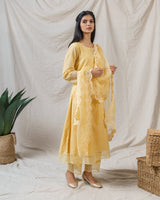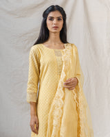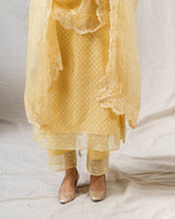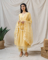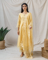 Iris yellow Kurta with delicate organza insert on the neckline, thread embroidered organza details, accented with thread embroidered organza at the hem and sleeves.