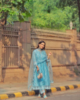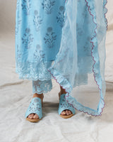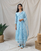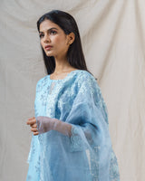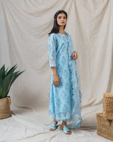 mist blue printed Kurta with delicate organza insert on the neckline, thread embroidered organza details, accented with thread embroidered organza at the hem and sleeves.