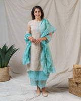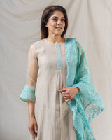 Pebble grey Kurta with delicate organza insert with contrasting thread work on the neckline, thread embroidered organza details, accented with thread embroidered organza at the hem and sleeves.
