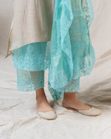 Turquoise dupatta in tissue with delicate scallop-edged hem thread work.