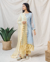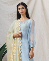 frost blue kurta with tissue insert in the center, accented with a hand crafted flower on the side.