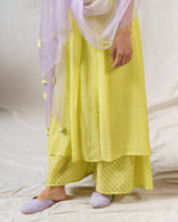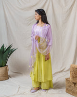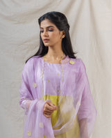 Dual color kurta with lime green hand crafted delicate motif on lilac nile chanderi upper, accented with a center pleat and rounded edges at the hem.