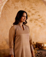 A chanderi tissue kurta highlighted with thread embroidered border on the bodice, sleeves and ghera highlighted with sequin.