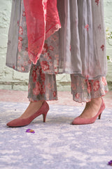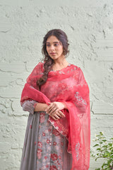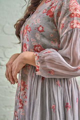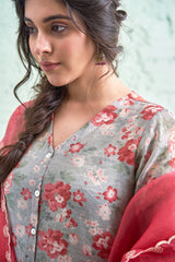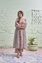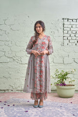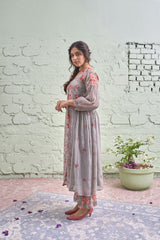 A printed zari kurta in bluish grey with fine chanderi panels on the sides highlighted with hand embroidered flowers in thread.