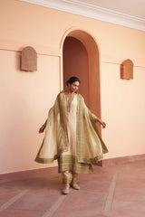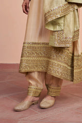A chanderi kurta in light beige with heavy sequin and thread border at the hem, embroidered border at the sleeve and work details at the neck.