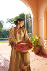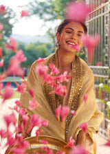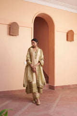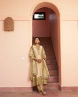Fabrics:Â Â Kurta: chanderi, Pant: chanderi, Dupatta: chanderi with gold lines