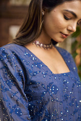 A chanderi cord set with all over embroidery in thread and sequin in a beautiful blue tone.