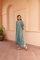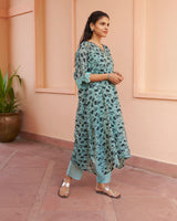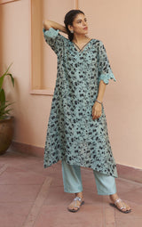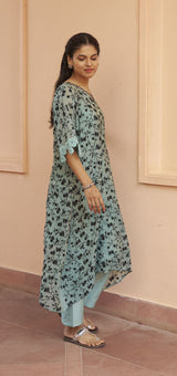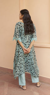 A kaftan in blue with full embroidered jaal in black thread on both sides( front and back ), accented with lace on the sleeves and organza details at the neck.