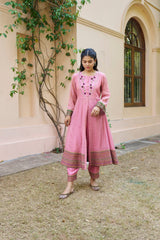 A pair of pants in chanderi with muli-coloured embroidered border at the hem.