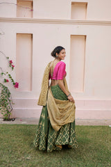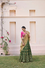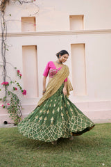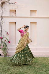 A kalidar deep green lehenga with fully embroidered kalis in gold thread and a full ghera to enhance the look.