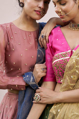 A hot pink colour blouse with front hook and hand crafted motif in green thread with gold sequin accented with a v-cut back.