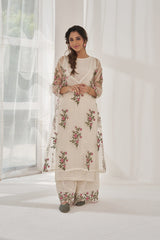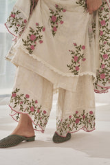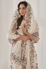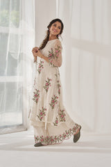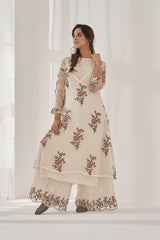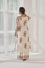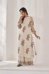 A fully thread embroidered kurta in offwhite with a pure organza cover, highlighted with flowers in thread