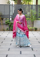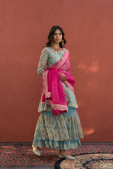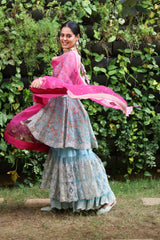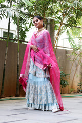 Fabrics: peplum: printed zari, Sharara; chanderi , Dupatta: organza