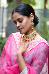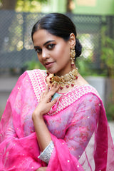 A hot pink dupatta  in organza accented with a four side border in golden silver zari work