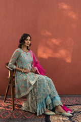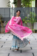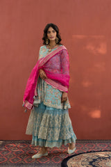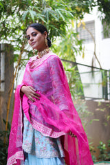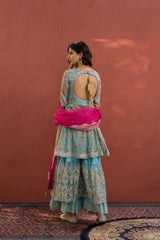 A layered sharara in chanderi accented with golden silver work on both layers.
