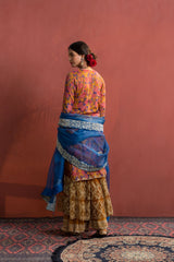 A layered sharara in chanderi accented with golden silver work on both layers.