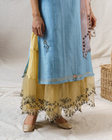 A mist blue fine chanderi kurta with black thread handcrafted details, accented with dull gold sequin flowers.
