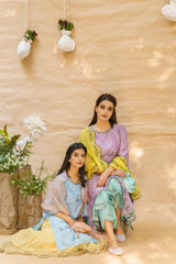A pale yellow layered sharara in fine chanderi and organza with hand embroidered details on organza at the hem.Â