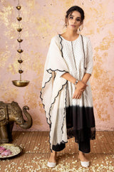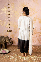 White and black Ombre kurta set with black embroidery details on the bodice and black schiffli on the hem