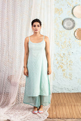 Embroidered powder blue chanderi tunic with pink organza overlay and zari loose pants with an embroidered sequins flower at the black
