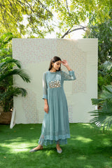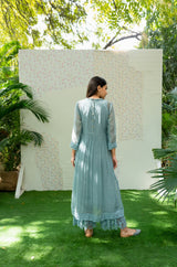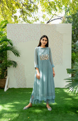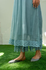 A fine cotton chanderi tunic in powder blue with hand crafted floral garden, highlighted with lace details on the upper bodice, accented with lace sleeves.